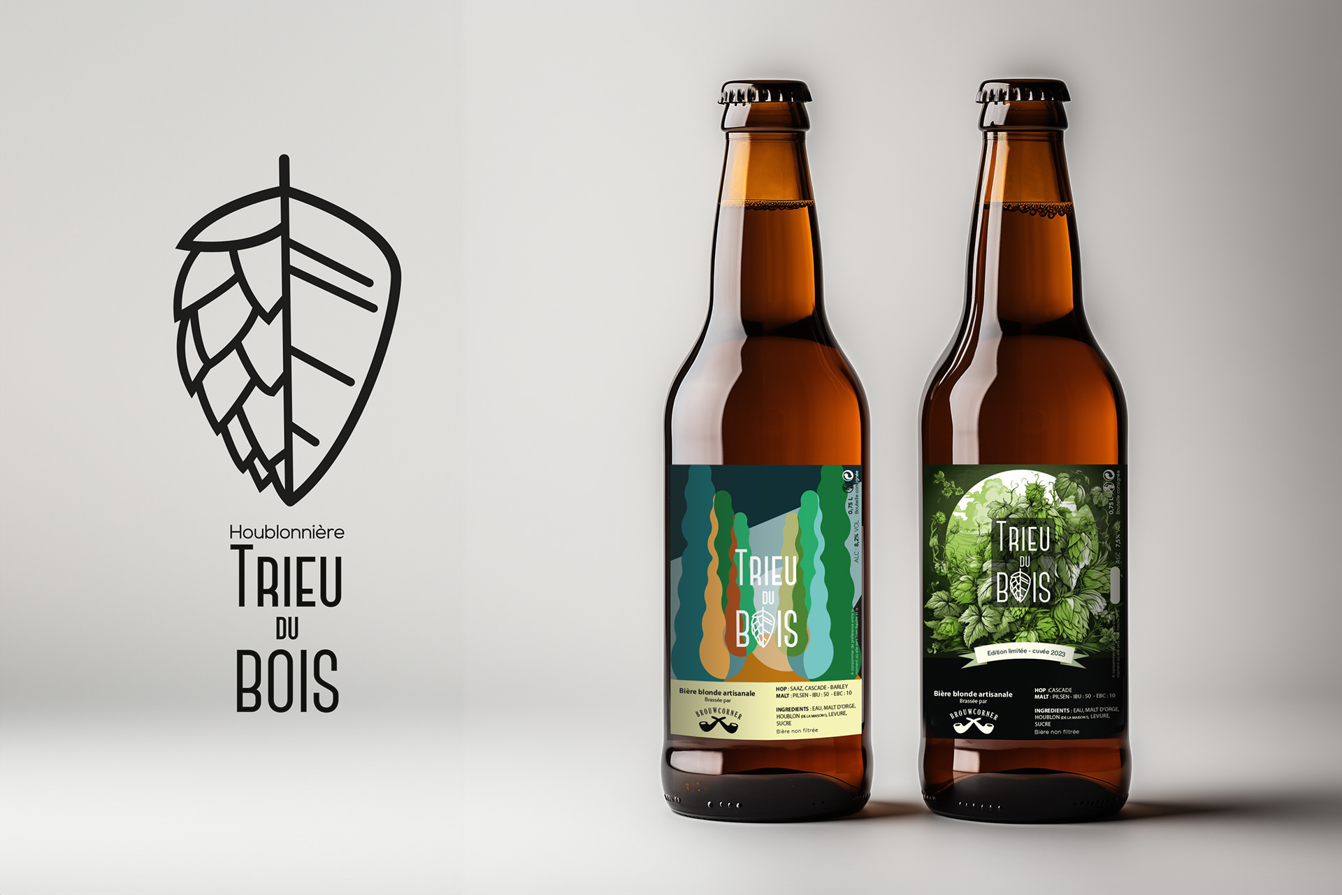 Création de l'image de marque de la houblonnière "Trieu du bois" et création des graphismes pour les différentes étiquettes de cette microbrasserie locale.